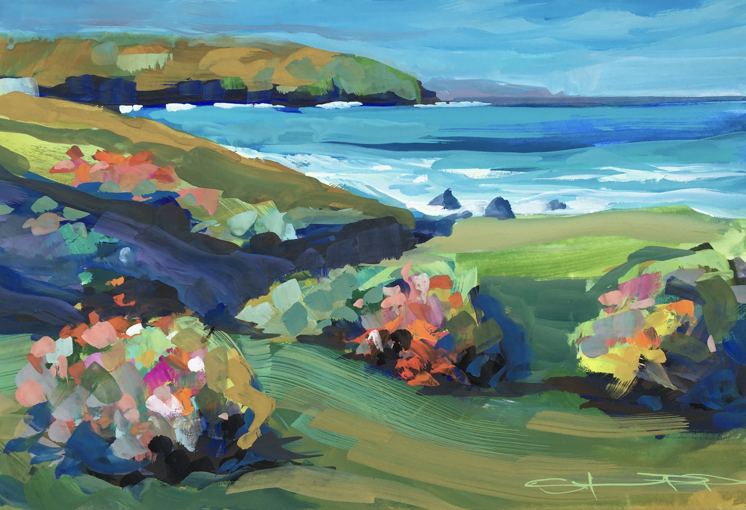 “Down the Coast” breezy, fresh wind, warm sun, sea spray, turquoise ocean, waves crashing onto the rocks, just a beautiful day.